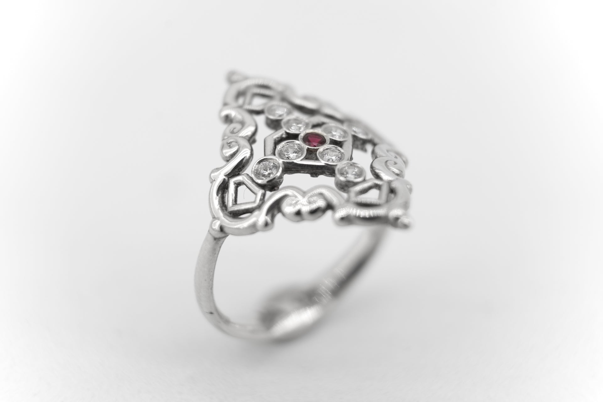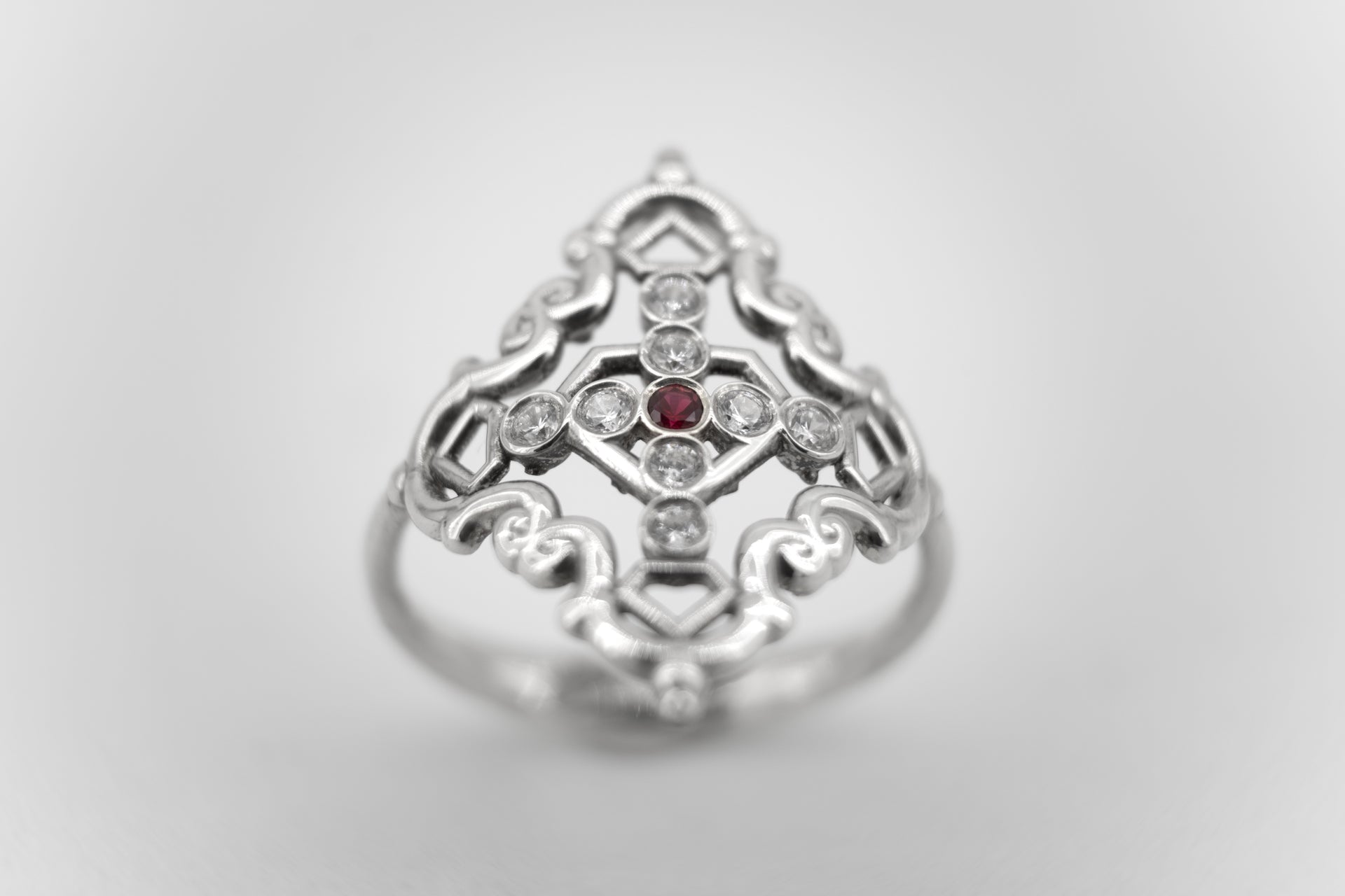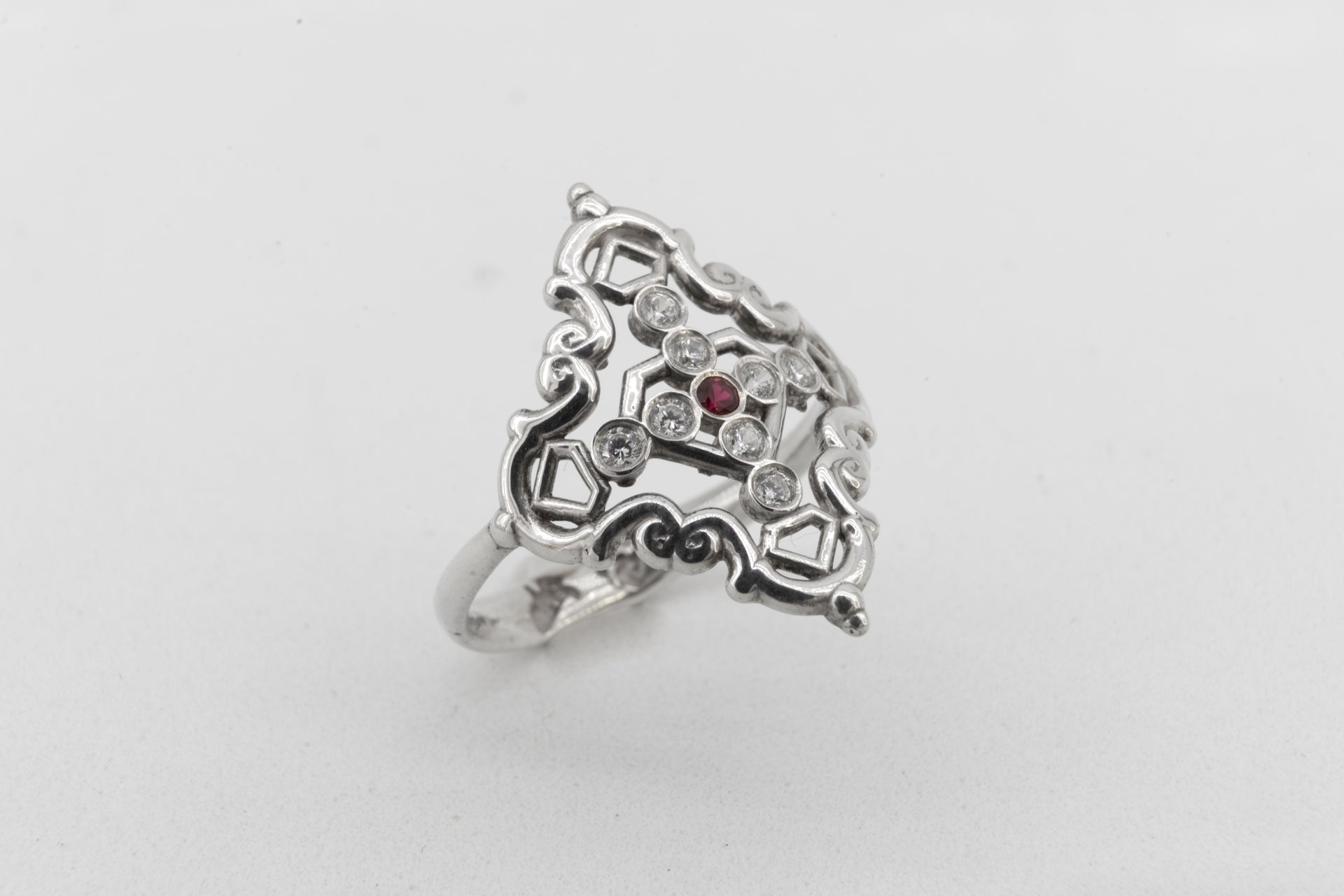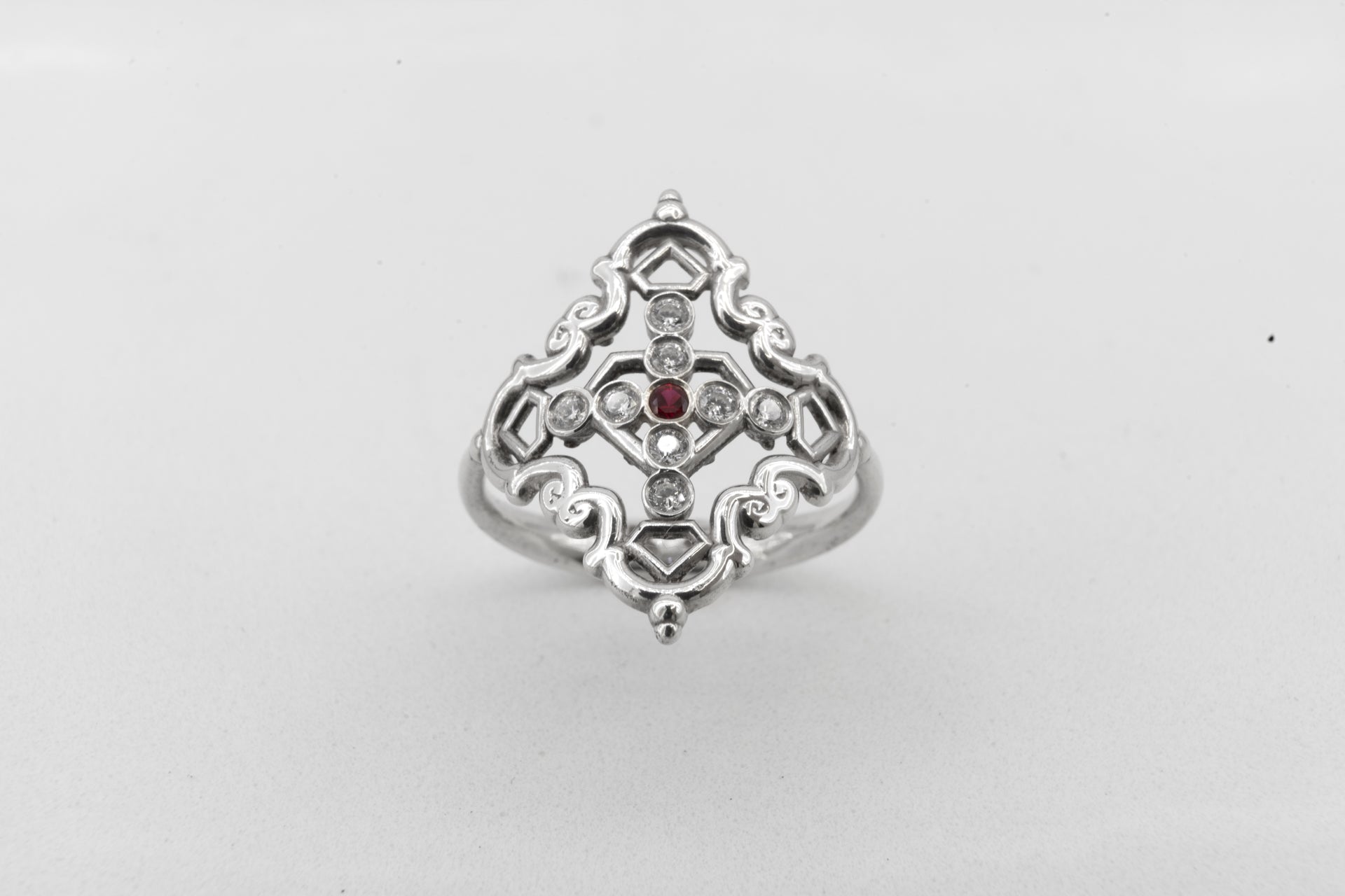 Anillo Creu Mallorquina JVP Rococó V1 Circonitas Blancas y Roja